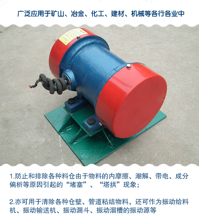 防止和排除各種料倉由于物料的內(nèi)摩擦、潮解、帶電、成分偏析等原因引起的“堵塞”、“塔拱”現(xiàn)象;亦可用于清除各種倉壁、管道粘結(jié)物料,還可作為振動(dòng)給料機(jī)、振動(dòng)輸送機(jī)、振動(dòng)漏斗、振動(dòng)溜槽的振動(dòng)源等。廣泛應(yīng)用于礦山、冶金、化工、建材、機(jī)械等各行各業(yè)中。