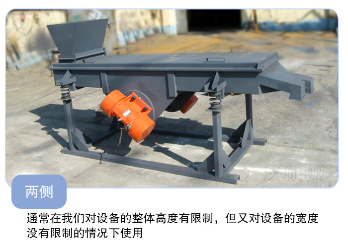 一、兩側(cè):這種安裝方式也是直線振動篩設(shè)備振動電機較為采用的方法。通常在我們對設(shè)備的整體高度有限制,但又對設(shè)備的寬度沒有限制的情況下使用。比如因為一些物料的特殊要求,設(shè)備的出料口不能離地太高啦,在這種情況我們?nèi)绻烧駝与姍C安裝在直線篩的底部或者頂部,那么設(shè)備的整體高度就不好控制了。一般來說直線篩的篩箱的高度通常是一定的,所以我們不能對篩箱的高度做調(diào)整,這是就可以考慮將振動電機安裝在直線篩的兩側(cè),這樣可以大大的降低設(shè)備的整體高度,又不影響設(shè)備的工作效率。