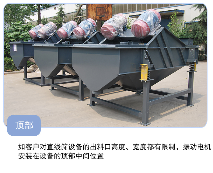 這種安裝方式在HYSF系列直線振動篩中是不常見,很少有人這么做,不過HYS直線篩通常采用這種安裝方式,如客戶對直線篩設(shè)備的出料口高度、寬度都有限制,那么振動電機不論是安裝在底部仍是兩側(cè)都不能達到要求,這時就可以將振動電機安裝在設(shè)備的頂部中間位置,這樣既不增加設(shè)備的寬度,又不影響降低設(shè)備出料口的高度。