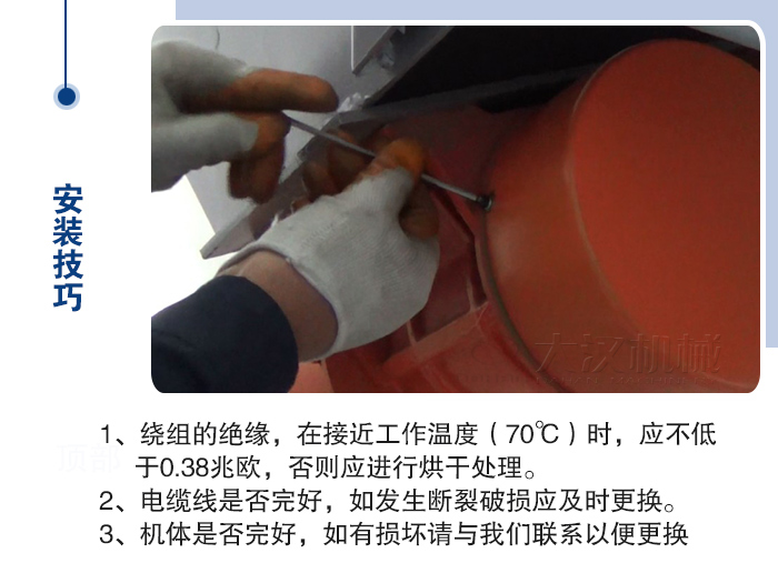 振動電機與振動機械連接平面粗糙度均應(yīng)為3.2或更高。1、繞組的絕緣,如受潮應(yīng)采用相應(yīng)方法處理500V兆歐表檢查繞組的絕緣電阻,在接近工作溫度(70℃)時,應(yīng)不低于0.38兆歐,否則應(yīng)進行烘干處理。