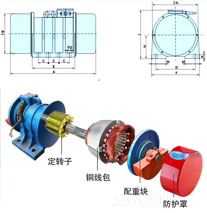 YZUL型立式振動(dòng)電機(jī)是動(dòng)力源與振動(dòng)源結(jié)合為一體的激振源,振動(dòng)電機(jī)是在轉(zhuǎn)子軸兩端各安裝一組可調(diào)偏心塊,利用軸及偏心塊高速旋轉(zhuǎn)產(chǎn)生的離心力得到激振力。由電機(jī)本身運(yùn)行產(chǎn)生易于調(diào)整的水平、垂直、傾斜等方向多元激振力,形成物料的快速平面分散、中心聚集、平面旋轉(zhuǎn)、三維旋轉(zhuǎn)等多種運(yùn)動(dòng)方式,用于控制排料速度、處理精度等機(jī)械性能指標(biāo),以其獨(dú)特的結(jié)構(gòu)特點(diǎn)適應(yīng)于不同的機(jī)械對振動(dòng)源的要求。